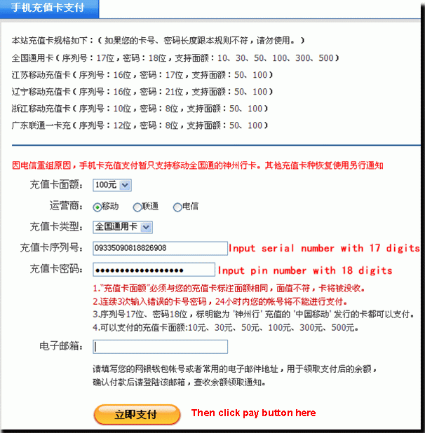 5.Note down order, then Input serial number (17 digits) and pin code (18 digits) of mobile recharge card and click the yellow pay button;